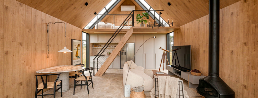 Integração e Verticalidade: aproveitamos o pé-direito generoso da cabana para criar um mezanino funcional. A escada de madeira, com desenho leve, conduz à área de relaxamento superior, onde o uso de grandes aberturas zenitais permite que o hóspede contemple o céu estrelado ou a neblina característica da região.